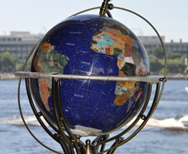 Globo: Mar azul marinho em quartzo, paises em pedras preciosas, gira e acende